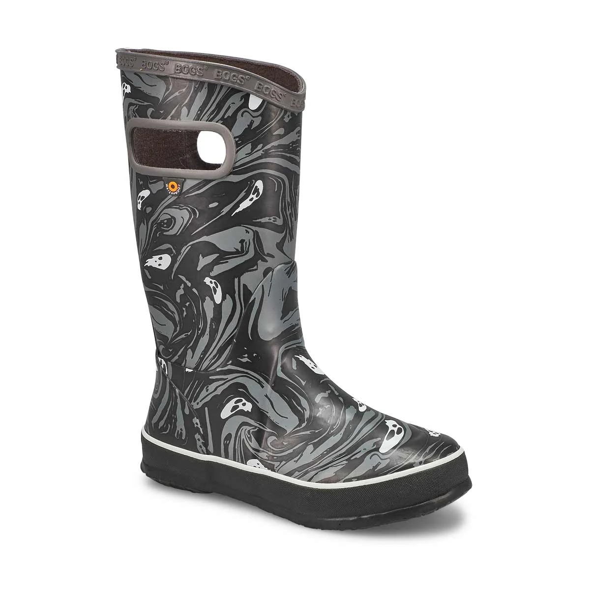 The Spooky Waterproof grey/ multi Rain Boot from Bogs is sure to elevate their attitude on those gloomy days. Pull-on waterproof boots designed in a rubber upper with pattern along the shaft. Cushioned footbed features MaxWick performance to move sweat away from foot to keep you dry longer. Non-marking, slip-resistant rubber outsole with a self-cleaning tread.